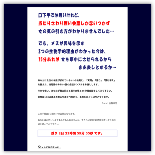 どれだけ効果が確実なものであっても、恋愛テクニックをたくさんの人に試してみるのは感心しません。パートナーになりたいと真剣に想っている相手にのみ駆使するようにしなければなりません。